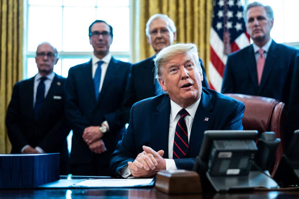 WASHINGTON, DC – MARCH 27: U.S. President Donald Trump speaks during a bill signing ceremony for H.R. 748, the CARES Act in the Oval Office of the White House on March 27, 2020 in Washington, DC. Earlier on Friday, the U.S. House of Representatives approved the $2 trillion stimulus bill that lawmakers hope will battle the the economic effects of the COVID-19 pandemic. (Photo by Erin Schaff-Pool/Getty Images)